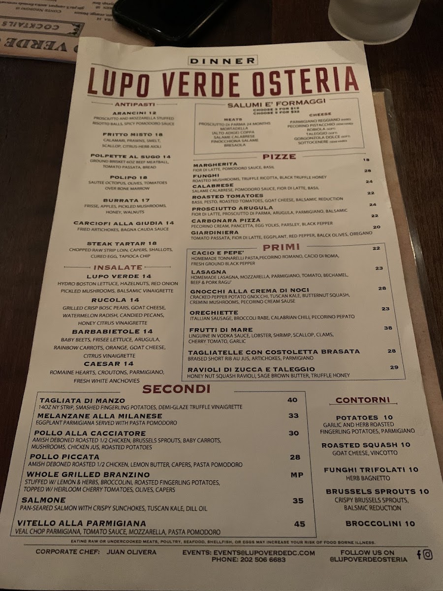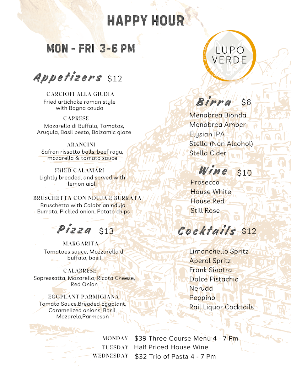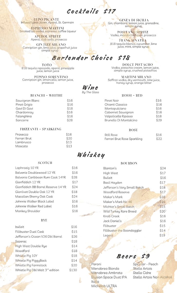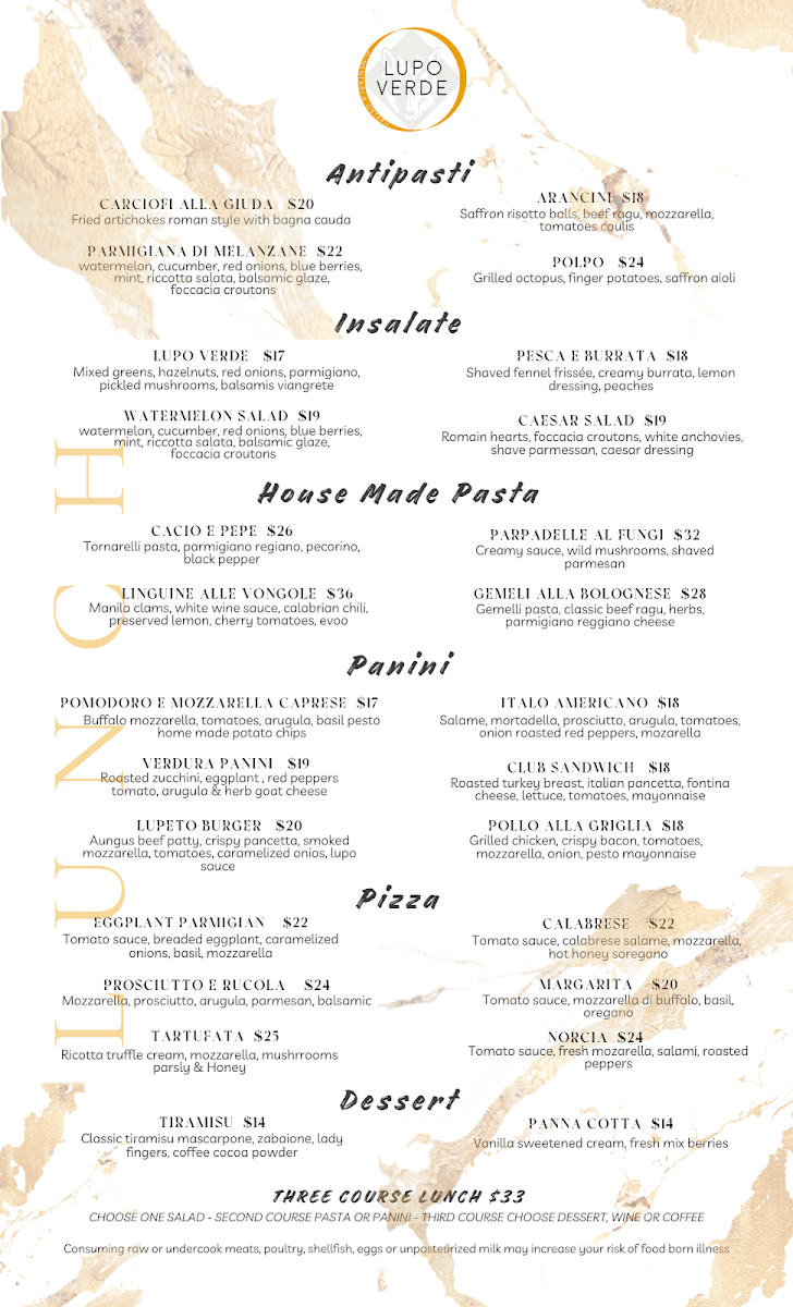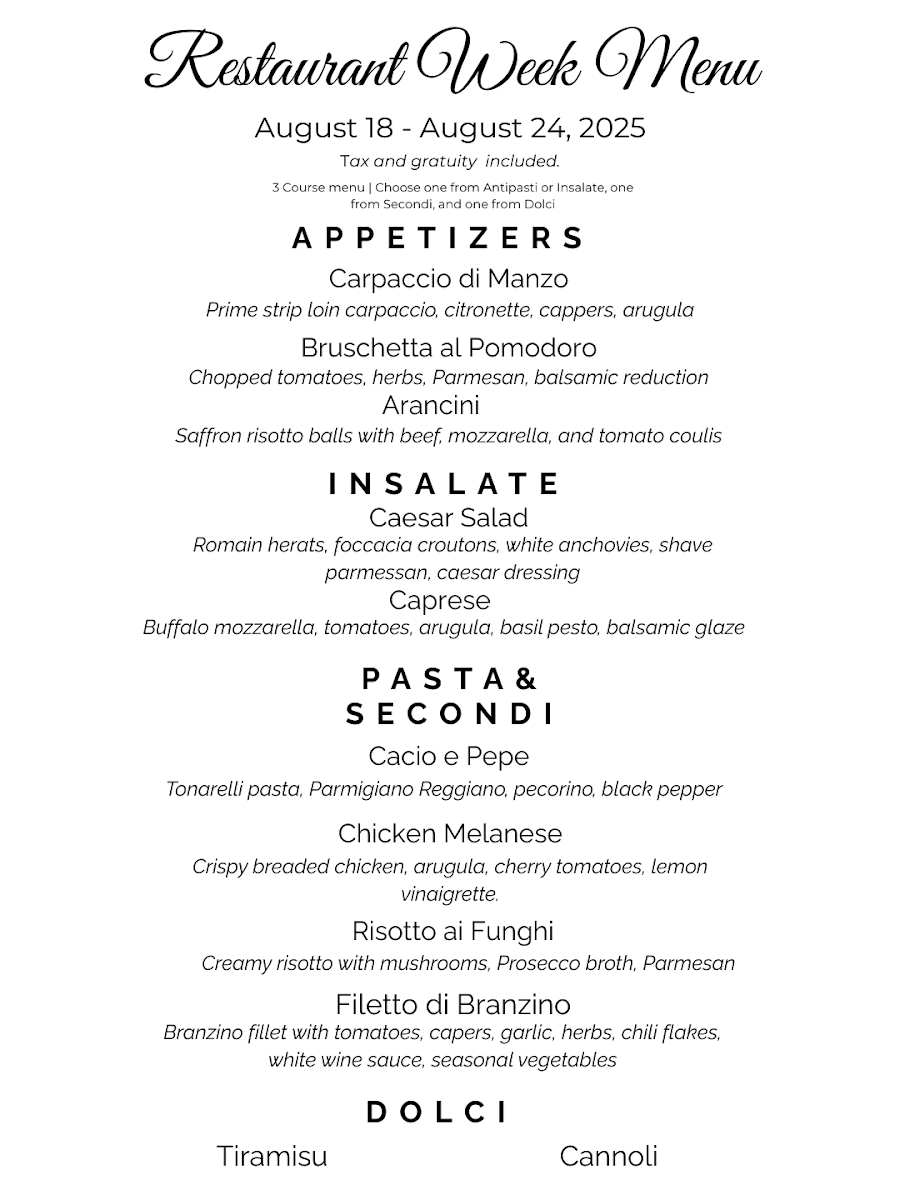 Course 1: Choice of beef carpaccio, tomato bruschetta, arancini, Caesar salad, or Caprese salad. Course 2: Options include Cacio e Pepe pasta, chicken Milanese, mushroom risotto, or sea bass fillet. Course 3: Select from tiramisu or cannoli.